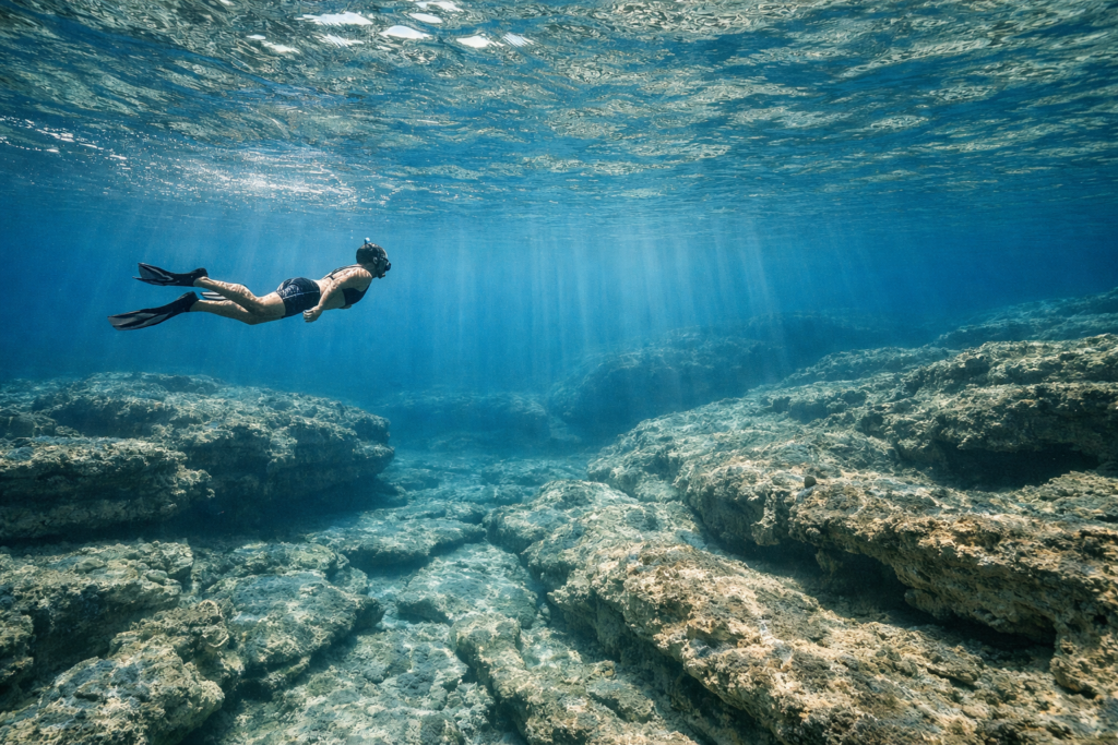 There is no heavy equipment, no briefing boards, no descent lines — just a quiet entry from rock or sand into water that often reveals its clarity before you are fully submerged. The island’s limestone coastline, so dramatic above sea level, continues beneath it in shelves, arches and shallow drop-offs ideal for surface exploration.